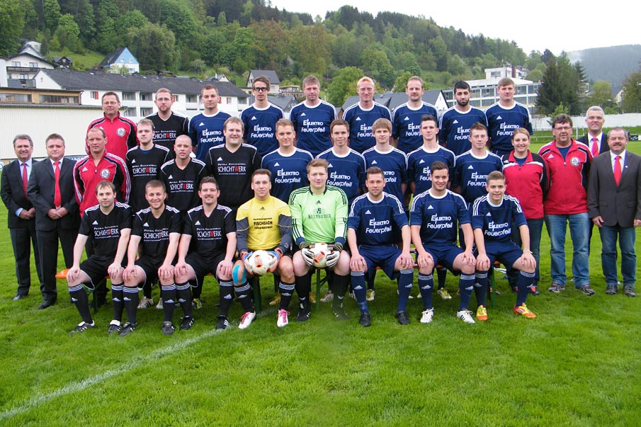mittlere Reihe v.l.: Hubert Wabnik (stellv. Abteilungsleiter), Andreas Wohlfahrt (Abteilungsleiter), Stefan Gehring (Trainer 1. Mannschaft), Mario Meister, Ralf Schmidt, Julian Schmidt, Sebastian Schmidt, Florian Fischbach, Julian Herrmann, Lukas Wäcker, Florian Lungmuß, Dominique Berndt (medizinische Betreuerin), Jürgen Schmidt (Spielleiter), Timo Ehrhardt (1. Bürgermeister), Thomas Häring (1. Vorsitzender);