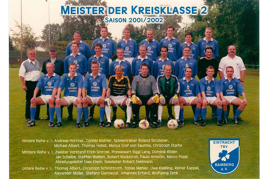 TSV Eintracht Bamberg, Meister Kreisklasse 2 2001/02, hintere Reihe v.l.n.r.: Andreas Horcher, Günter Kistner, Spielertrainer Roland Strohmer, Michael Albert, Thomas Hobst, Marius Graf von Saurma, Christoph Starke, mittlere Reihe v.l.n.r.: Zweiter Vorsitzender Erich Smrcek, Pressewart Siggi Lang, Dominik Röder, Jan Scheibe, Stefan Wellein, Robert Rockstroh, Paulo Amorim, Marco Popp, Abteilungsleiter Uwe Kliem, Spielleiter Robert Seelmann, untere Reihe v.l.n.r.: Thomas Albert, Christoph Schmittroth, Tobias Mehler, Uwe Kießling, Reiner Kappel, Alexander Müller, Stefano Giannacoli, Wolfgang Zenk