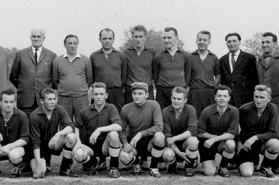 Die Mannschaft des ETSV 1930 Bamberg, die 1961 als Meister der A-Klasse Bamberg in die II. Amateurliga Oberfranken West aufstieg. Stehend von links nach rechts: Erster Vorsitzender Reuß, Urbanec, Koch, Sachs, Ponkratz, Schilling, Trainer Fack, Bauer. Kniend von links nach rechts: Hertel, Eisinger, V. Schieweck, E. Schieweck, Smrcek, Nikol, Schumm.