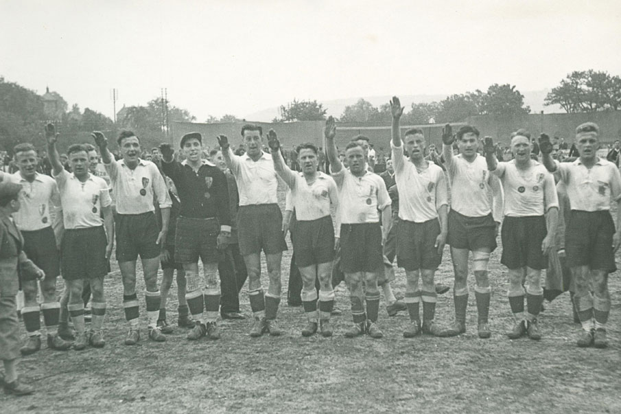 Am 12. Juni 1938 trennten sich die Würzburger Kickers und der VfB Coburg in der Aufstiegsrelegation zur Gauliga Bayern unentschieden 1:1. Im Bild die Mannschaft aus Coburg, die sich am Ende gegen ihre Konkurrenten durchsetzte und nach einjähriger Abstinenz in die Gauliga zurückkehrte.