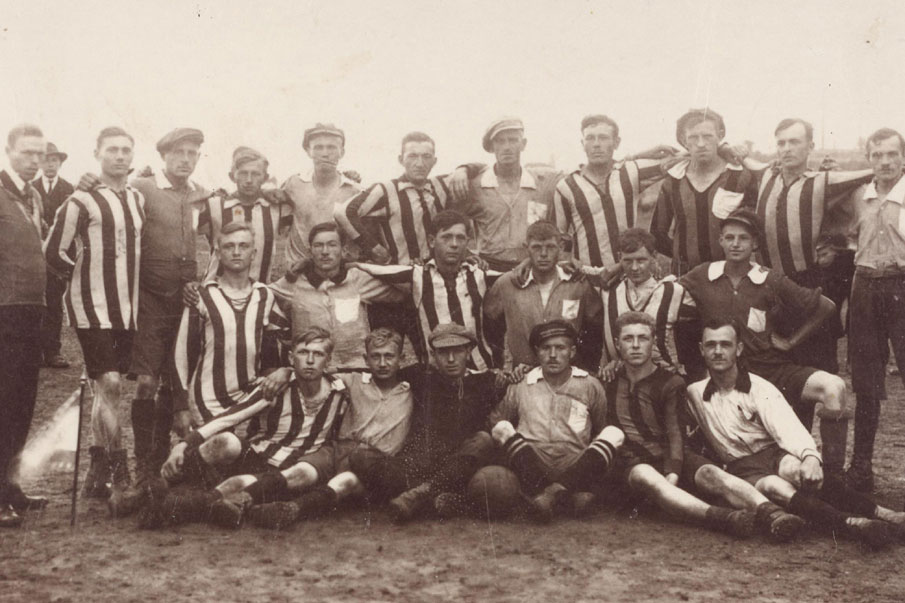 Die Mannschaft der Freien Turner Bischberg anlässlich eines Spiels in Haßfurt am 13. Juli 1919.