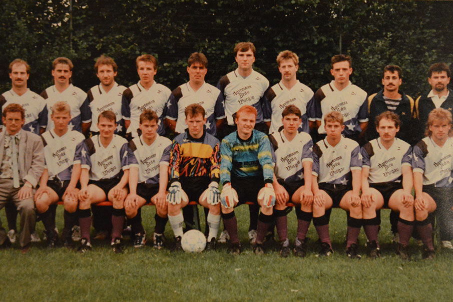 Als Vizemeister der A-Klasse Bamberg Nord stieg der SV Würgau 1991 in die Bezirksliga Oberfranken West auf. Hintere Reihe von links nach rechts: Thomas Schmelzer, Klaus Hartmann, Bernhard Hemmer, Stefan Hauptmann, Norbert Hartmann, Otto Nüßlein, Willi Löhr, Roland Hauptmann, Klaus Mirlach, 2. Vorsitzender Georg Düthorn. Vordere Reihe von links nach rechts: 1. Vorsitzender Rudolf Weber, Ludwig Löhr, Manfred Götz, Franz Türkon, Stefan Lorber, Harald Götz, Jochen Braun, Mario Schmelzer, Kunibert Hemmer, Siegfried Grasser.