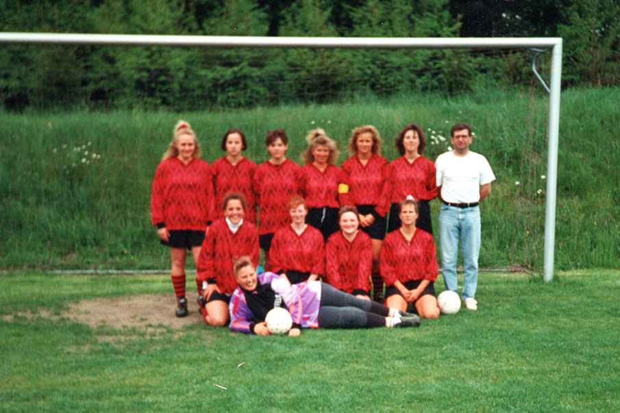 Das Frauenteam des 1. FC Lichtenfels in der Saison 1993/94. Stehend von links nach rechts: M. Waidhas, P. Zeulner, M. Kaufmann, H. Zitzelsberger, D. Hohl, C. Lotz, Betreuer A. Scherbel. Kniend von links nach rechts: A. Thierauf, R. Hüls, A. Huck, S. Göhring. Liegend: A. Wirsching.