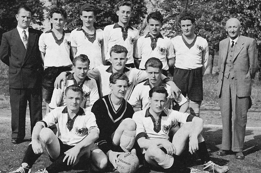 Die Mannschaft des FC Adler Weidhausen in der Saison 1954/55. Hintere Reihe von links nach rechts: Trainer M. Friedmann, A. Backert, A. Butz, W. Bülling, Helmut Knauer, D. Martin, 1. Vorsitzender W. Mönch. Mittlere Reihe von links nach rechts: W. Butz, S. Hofmann, K. Busse. Vordere Reihe von links nach rechts: W. Knauer, H. Kugelberg, Horst Knauer.