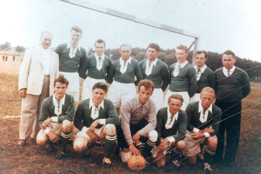 Die Mannschaft des SV Würgau in der Saison 1956/57. Stehend von links nach rechts: Dr. Wegener, Landgraf, E. Schmelzer, P. Hauptmann, R. Hartmann, H. Hauptmann, H. Schmelzer, Meißburger. Kniend von links nach rechts: Herold, A. Hartmann, Lehner, Spörlein, Krapp.