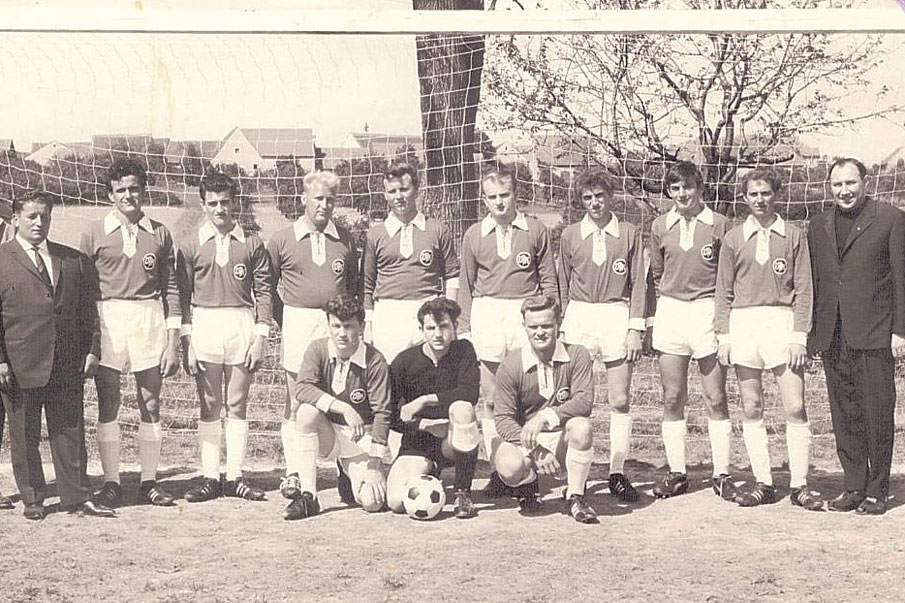 Die Gründungsmannschaft der DJK Schnaid/Rothensand im Jahre 1966. Stehend von links nach rechts: 1. Vorstand Michael Holzmann, Ludwig Weber, Rainer Roppelt, Hans Herzogenrath, Otto Postler, Werner Zöbelein, Erich Christel, Gerhard Butzbacher, Georg Christel, Geistlicher Beirat Hans Wich. Kniend von links nach rechts: Norbert Postler, Erwin Harrer, Alois Bonier. Es fehlt: Siegbert Postler.