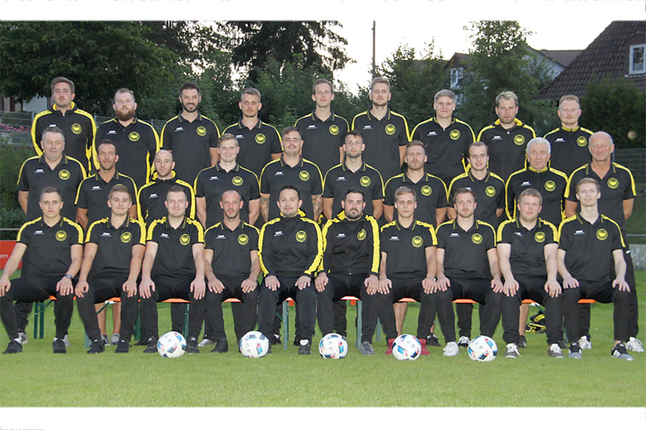 Mitte von links: Fußball-Abteilungsleiter Timo Walch, Spielertrainer Gerardo Cannone, Fabio Cannone, Erik Freitag, Lukas Hartan, Lion Muggenthaler, Fabian Schneider, Julian Lang, Spielausschussmitglied Dieter Gundermann, Spielleiter Uwe Weihermüller.