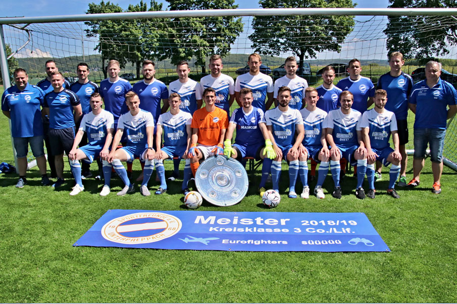 Und stehend von links: Vorsitzender Dominik Präger, Johannes Becht, Johannes Dietz, Spielleiter Marcel Leipold, Daniel Limpert, Philipp Müller, Christian Griebel, Patrick Lübberstedt, Joseph Weiß, Dominik Winkelmann, Michael Walz, Jürgen Lutsch, Spielleiter Berthold Schor und 2. Vorsitzender Gerald Oppelt.