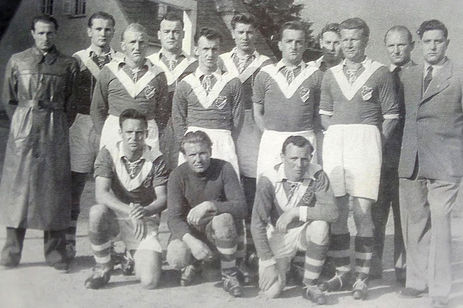 Die erste Zeller Meistermannschaft der Geschichte. Hinten v. links: Trainer Georg Löw, Oswald Schlick, Hans Strößenreuther, Alfred Käppel, Helmut Werner, Heinrich Benker, Heinz Beck, Gerhard Knieling, Fritz Kilian, 1. Vorstand Heinrich Spachtholz, Spielleiter Hermann Schneider. Vorne v. links: Hilmar Puchta, Christian Strößenreuther und Karl Ittner.