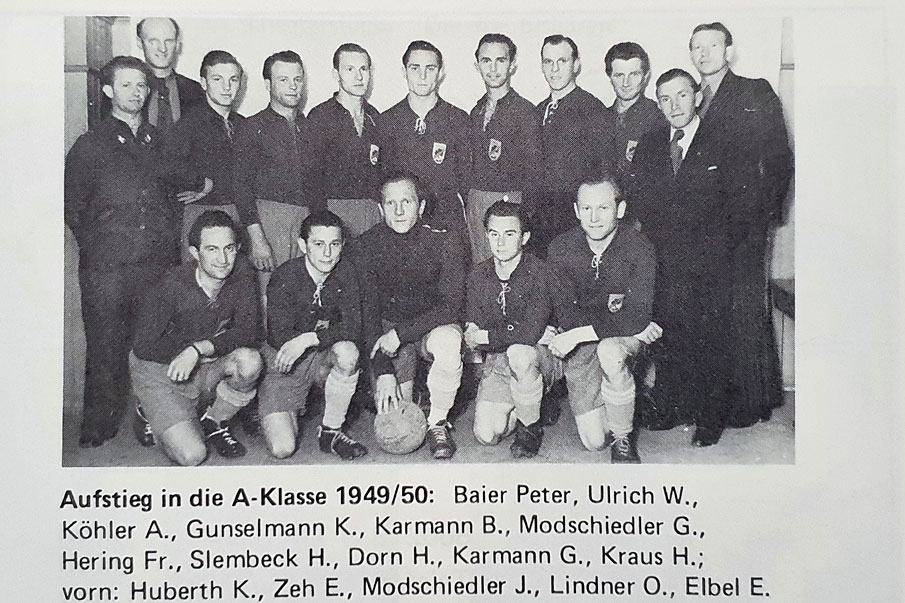 In der Saison 1949/50 feierte diese Elf den Aufstieg in die A-Klasse: Peter Baier, W. Ulrich, A. Köhler, K. Gunselmann, B. Karmann, G. Modschiedler, Fr. Hering, H. Slembeck, H. Dorn, G. Karmann, H. Kraus.