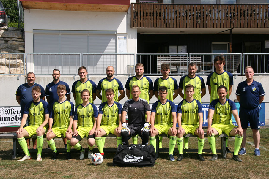 Trainer Jürgen Born, Betreuer Patrick Gradl, Daniel Siegler, Fabian Ziegler, Mathias Trenz, Robin Popp, Dominik Maier, Leon Haberberger, Spielleiter Ralf Tetzeli von Rosador (stehend, v.l.n.r.). Nicolas Bauer, Jannik Friedl, Silas Kohl, Marcel Rieger, Patrick Schmid, Benedikt Schindler, Constantin Neukam, Christof Lindner (sitzend, v.l.n.r.).