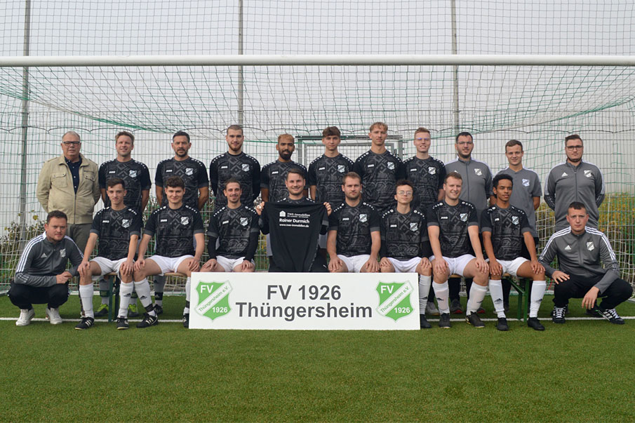FV 1926 Thüngersheim 2, Würzburg. H.v. links: Rainer Durmich (Sponsor), Martin Gutbrod, Matthias Urlaub, Leon Böhn, Taweesak Ngoenprong, Nick Schäfer, Tim Schäfer, Jakob Schulz, Christian Mais (TW Trainer), Jonas Ferstl (Co-Trainer), Nicolas Röder (Trainer)