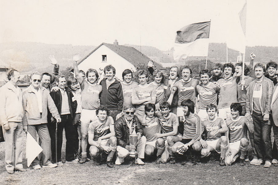 Nach einem 4:1-Sieg über Haig holt der 1.FC Stockheim die Meisterschaft und steigt zum 2. Mal in die Bezirksliga auf. Stehend v.l. Georg Fehn (Fan), Ernst Morand (Fan), Kurt Trögel (Fan), Schriftführer Paul Schröder, Bernd Kern, Kapitän Lehnhardt (winkend); Trainer Marose, Wicklein, Wachter, F. Loika, Eberhard Dauer (Fan), K. Wisnewski, J. Loika, Schneider, Baier, Dieter Preiss, R. Wisnewski, Möhrle, Grebner - unten v.l. Fehn, R. Renk, Manfred Renk, O. Renk, Baptist Schülner, Schröder, Bauer