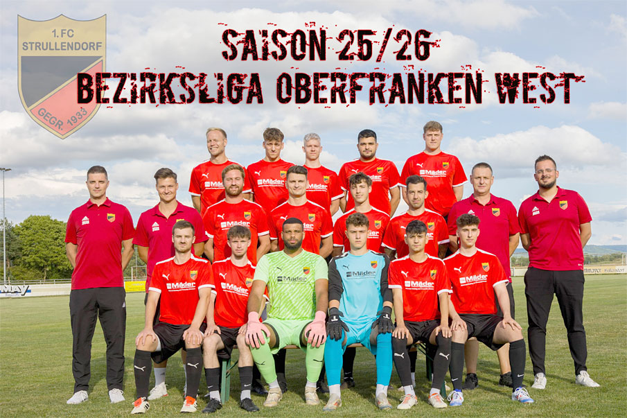 1. FC Strullendorf. Oben v.l.: Nico Wunder, Maximilian Drozd, Pascal Reinfelder, Onurhan Ergün, Jan Schonert. Mitte v.l.: Co-Trainer Thomas Schmitt, Trainer Michael Pfänder, Niklas Griebel, Julian Glos, Marcel Dotterweich, Dominik Sperlein, Spielleiter Markus Graf, Sportlicher Leiter Sergio Dias. Unten v.l.: Daniel Schücker, Dominik Wölfert, Michael Edemodu, Hermann-Otto Horst, Oguzhan Ergün, Marcel Graf. Es fehlen: Maximilian Zweckbronner, Firat Güngör, Johannes Kunert, Pascal Schneider, Simon Bube, Kadir Öz, Michael Zöllner