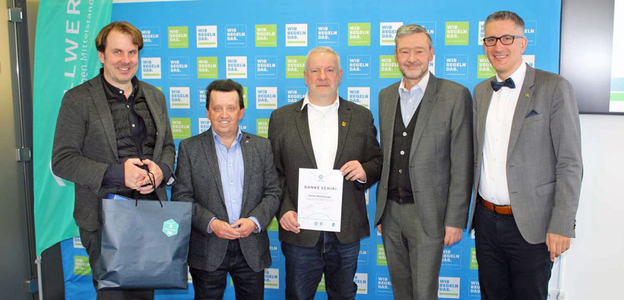 Aktion "Danke Schiri" - Ehrung im Bezirk Mittelfranken (von links): Michael Oschmann (CEO SELLWERK/Das Örtliche), Bezirks-Schiedsrichterobmann Siegmar Seiferlein, Schiedsrichter Dieter Wolfsberger (Ü50), BFV-Vizepräsident Robert Schraudner, Verbands-Schiedsrichterobmann Sven Laumer.