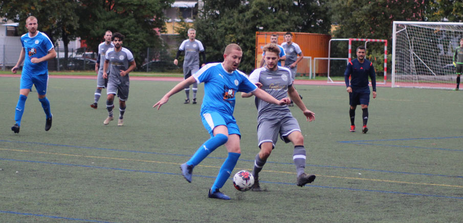 Rafael Malicevic (in blau, Nummer 7) und der TSV Azzurri II wollen ihren positiven Lauf weiter fortführen. Die DJK Oberasbach um Nelson Izevbizua (in schwarz, am Ball) will die Niederlage vom vergangenen Wochenende vergessen machen und wieder dreifach punkten.