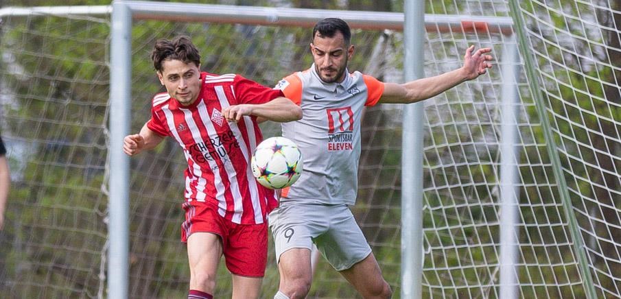 Spitzenreiter SV Gutenstetten-Steinachgrund siegte bei der SGV Nürnberg-Fürth 1883 (in weiß) mit 4:1 und verteidigte seinen Vorsprung. Ganz so klar wie das Ergebnis glauben machen möchte, verlief die Partie aber nicht, schließlich vergab die SGV in entscheidenden Phasen dicke Gelegenheiten. Hier ließ beispielsweise Ozan Yildirim (r.) gegen den weggerutschten Stetten-Schlussmann Himmrich die Chance zur Führung liegen.