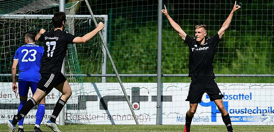 Lukas Seebauer (r.) und der TSV Cadolzburg schrauben am Wunder: Die Sporcher siegten im Kellerduell gegen die SGV Nürnberg-Fürth 1883 mit 2:0. Dadurch halten die Hausherren ihre kleine Chance auf die Relegation aufrecht, während die SGV nach der Pleite nach wie vor noch den Sturz auf eben jenen Schleudersitz befürchten muss.
