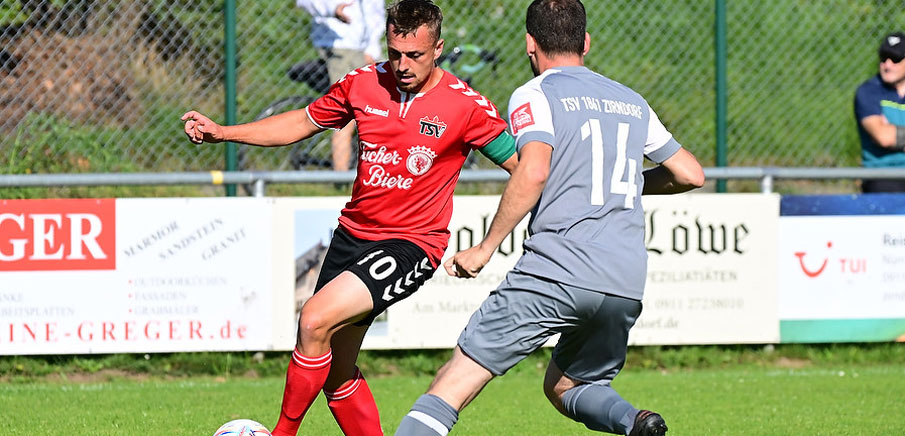 Max Oppitz (in rot) ist mit seinem TSV Roßtal bei der Zweitvertretung des STV Deutenbach gefragt und möchte mit einem Sieg weiter vorneweg marschieren. Der TSV Zirndorf um Fabio Dietl (in grau) könnte seinerseits die jüngst gute Form bestätigen, muss dabei aber beim ASV Fürth bestehen.