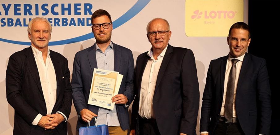 Bei der Ehrenamtspreisverleihung in München nahm Adiran Thellmann die verdiente Urkunde aus den Händen von BFV-Präsident Christoph Kern, Verbands-Ehrenamtsreferent Stefan Merkel, BFV-Vizepräsidentin Inge Pirner und Rudi Völler entgegen. Thellmann wird für sein herausragendes Engagement mit Begleitung außerdem zu einem Dankeschön-Wochenende eingeladen und wird mit dem „DFB-Club 100“ ein Länderspiel besuchen. Der TSV Waigolshausen darf sich für seinen Preisträger über einen Geldpreis von LOTTO Bayern freuen.