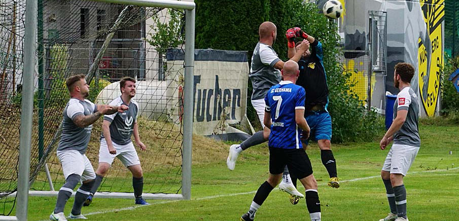 Am Sonntag ließ dann der SC Germania II (in blau) die Muskeln spielen und feierte beim ESV Flügelrad II einen 10:1-Kantersieg! Cesar Navarro Roa (r.) war mit drei Treffern einer der Hauptakteure auf Seiten der Germanen, die mit maximaler Ausbeute an der Spitze stehen.