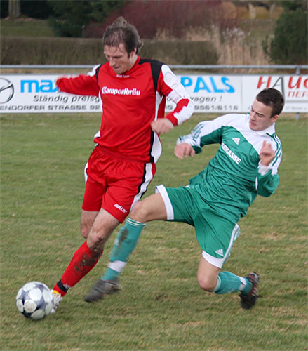 Einer der gefährlichen Untersiemauer Offensivspieler, den die Stöppacher zustellen wollen, ist Marcel Paschold (re.), der hier in der Vorsaison den Tambacher Torsten Ambrassat attackiert. |