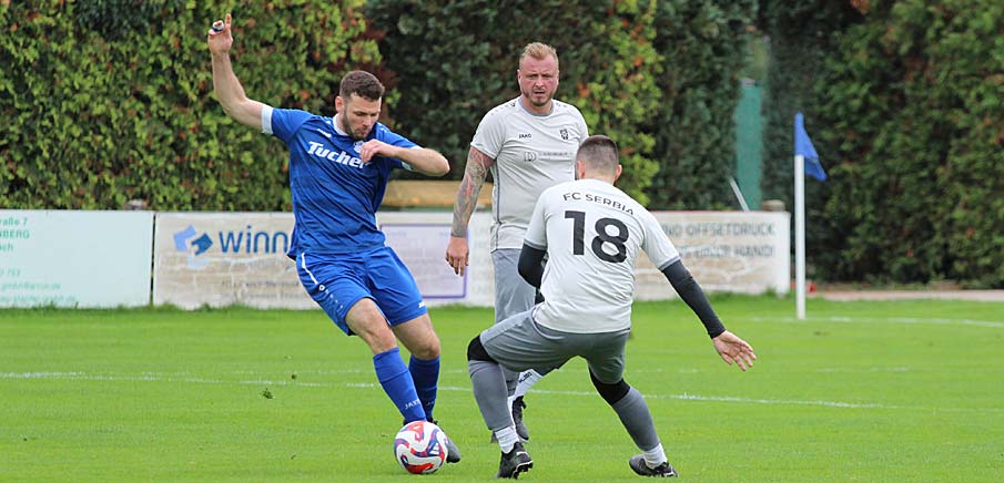 Wie auch hier in dieser Szene hatte derweil der TB Johannis 1888 II (in blau) gerade in der ersten Halbzeit gegen einen durchaus mutig auftretenden FC Serbia II die eine oder andere Schrecksekunde zu überstehen. Letztendlich konnte sich der Turnerbund aber doch mit 4:3 durchsetzen und sich so etwas Luft auf die Abstiegszone verschaffen. Die Serben hängen dagegen nach wie vor im Keller fest, können auf der gezeigten Leistung aber aufbauen.