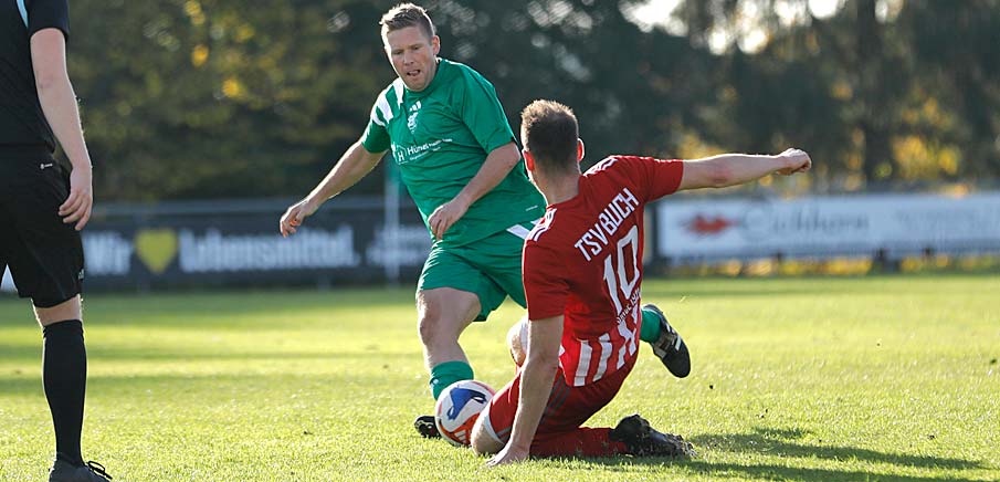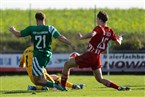 Zwei Treffer von Rick Bolz (in grün) sollten für den ASV Veitsbronn-Siegelsdorf am Samstag nicht zum Sieg reichen. Die Bucher Jungs (in rot-weiß) kamen zweimal nach Rückstand zurück und sicherten sich am Ende durch ein 2:2 einen Zähler.
