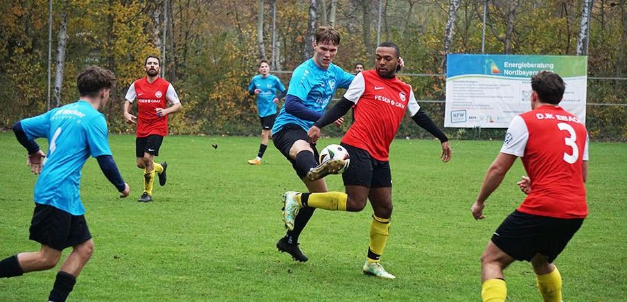 Begünstigt wurde der tabellarische Sprung des Aufsteigers durch das 1:1-Remis im anderen Nachbarschaftsduell zwischen der DJK Eibach II und dem SV Wacker (in blau), das mit einem 1:1-Remis und somit ohne Sieger endete. Hauensteins Führungstreffer per Elfmeter beschloss eine erfolgreiche Eibacher Anfangsviertelstunde, doch SVW-Kapitän Slotta egalisierte noch vor dem Seitenwechsel für seine Farben. Nachdem beide Seiten bereits im ersten Durchgang ihr Pulver verschossen hatten, blieb es bei dem Unentschieden, das keinem der beiden Kontrahenten wirklich weiterhilft.
