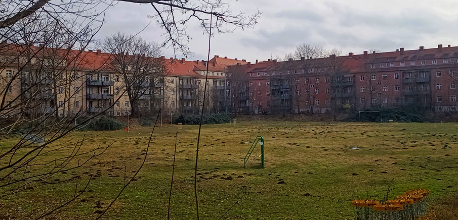 Man muss schon genau hinschauen, wenn man die Fußballtore am Krugsportplatz heute noch entdecken möchte. Die Maulwurfhügel sind schon leichter zu erkennen.