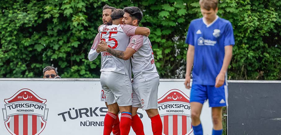 Gar einem Rückstand musste Türkspor im Heimspiel gegen den ASV Veitsbronn-Siegelsdorf (in blau) nachlaufen. Efekan Karaca (in grau) hatte aber wenig später die passende Antwort parat, traf zum Ausgleich und sorgte dafür, dass die Scigliuzzo-Elf das Blatt wenden konnte. Am Ende siegte Türkspor mit 3:1.