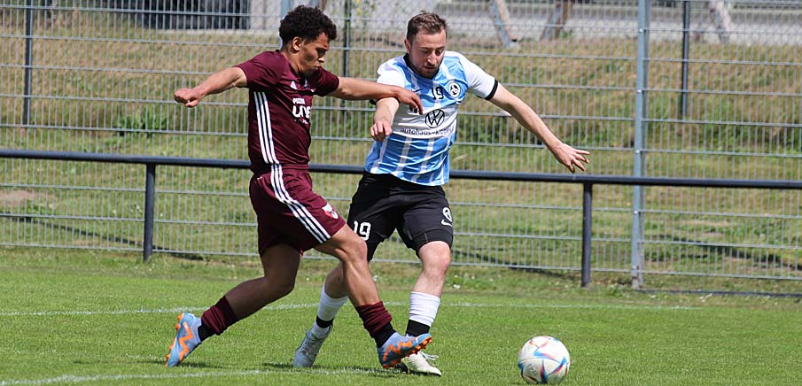 Für die Germanen (in blau-weiß) war es zwar das erwartet schwere Spiel, schließlich warfen Casper Zdrojewski (in rot) und die Gäste aus Ziegelstein alles in die Waagschale. Am Ende siegte der SCG jedoch knapp mit 3:2 - auch weil die Walter-Elf im zweiten Abschnitt mit zwei Gewaltschüssen an der Querlatte scheiterten. Die Gründlacher Meisterfeier wurde durch den Germania-Heimdreier also vertragt.