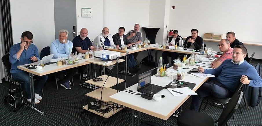 Kreisdialog Erlangen/Pegnitzgrund. Hinten von links: Harald Saß (Kreis-Spielleiter), Matthias Dresel (Kreis-Vorsitzender), Jürgen Igelspacher (BFV-Geschäftsführer), Manfred Weiher (Kreis-Sportgerichtsvorsitzender), Stefan Stadelmann (Kreis-Schiedsrichterobmann), Uwe Mauckner (Bezirks-Vorsitzender); vorne von links: Justin Pieger (Kreis-Jugendleiter), Manuela Schmidt (Kreisbeauftragte für Frauen- und Mädchenfußball), Reinhold Baier (BFV-Vizepräsident), Herbert Ziegler (Kreis-Ehrenamtsbeauftragter) und BFV-Präsident Christoph Kern