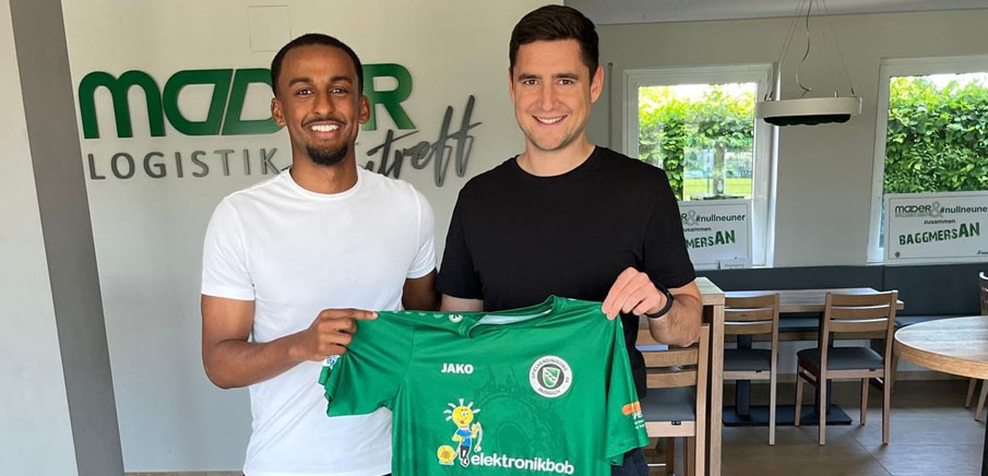 Noah Gebre Zerihun (l.) wechselt vom TSV Kornburg zur SpVgg Ansbach, wo er vom Sportlichen Leiter Christoph Hasselmeier begrüßt wurde.