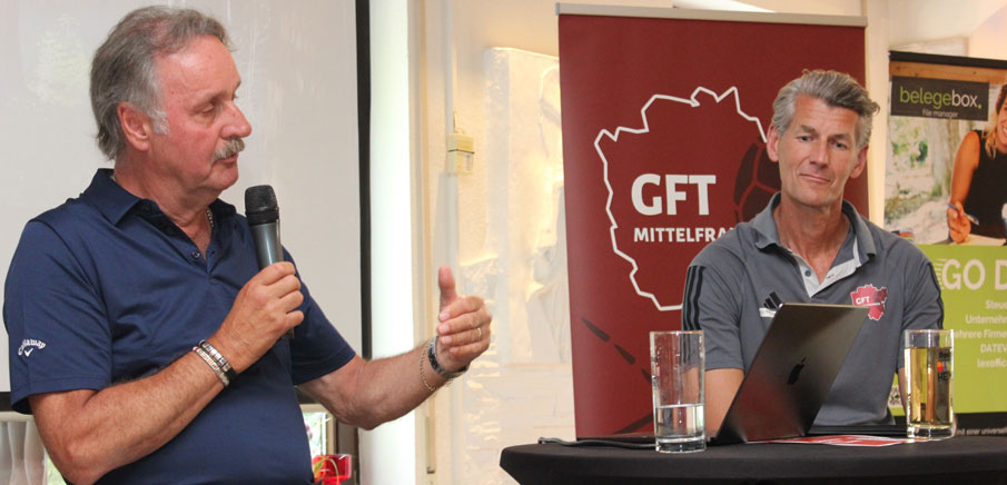 Peter Neururer (l.) war zu Gast bei der GFT Mittelfranken und hatte nicht auch einige praktische Tipps für die Trainer parat.