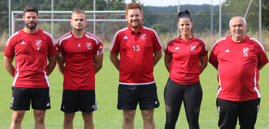 von links: Sportlicher Leiter Alexander Roth, spielender Co-Trainer Zweite André Folz, Physiotherapeut Tobias Wechsler, Physiotherapeutin Anna Wagner, Ilkay Korkmaz
