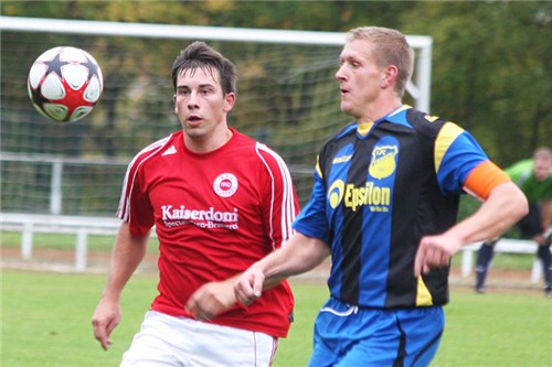 Kaum vom Ball zu trennen. Mario Meth (li. hier im Duell mit Domenique Will) ist der Top-Goalgetter der Bezirksoberliga.