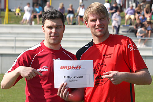 In der Halbzeitpause des Landesliga-Spiels DJK Don Bosco Bamberg – SV Memmelsdorf zog der DJK-Kapitän Marcus Lauterbach (re.) den glücklichen Gewinner Philipp Gleich aus Wallenfels. Links im Bild anpfiff-Geschäftsführer Andreas Baumgärtel.