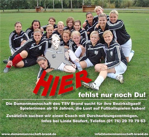 Hier wird gesucht! Bei angegebener Email - und Internet-Adresse sowie Telefonnummer kann man sich über die Damen des TSV Brand informieren. In Brand würde man sich über weiteren Zuwachs freuen.