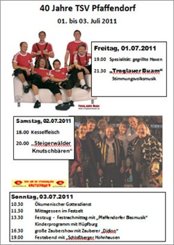 Von Freitag, 01.07.2011 bis Sonntag, 03.07.2011 ist es soweit. Der TSV Pfaffendorf feiert sein 40jähriges Vereinsjubiläum. Hier stellen die Organisatoren ein straffes Rahmenprogramm auf die Beine.