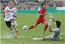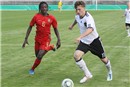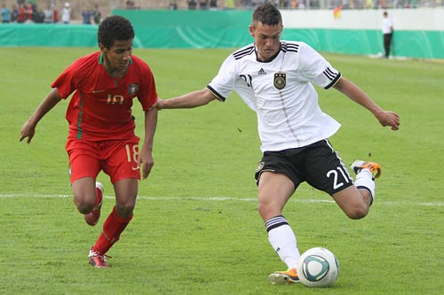 Für Abtasten war für die beiden Kontrahenten weder Zeit noch Wille vorhanden. Doch während die Portugiesen sich zu sehr auf ihre individuellen Fähigkeiten verließen, kombinierten die jungen Männer mit dem Bundesadler auf der Brust gefällig und kamen zu Chancen im Minutentakt. Dabei erzielte Bilal Kamarieh von Hertha BSC Berlin nach feiner Kopfballablage des Dresdners Patrick Pflücke schon früh den Führungstreffer, ehe Pflücke selbst per Kopf nachlegte und Julian Brand aus abseitsverdächtiger Position den 3:0 Pausenstand besorgte. Der einzige Franke in der Partie, der Nürnberger Torwart Florian Schwaiger, wurde wenig geprüft, zeigte sich aber bei einigen brenzligen Situationen stets auf dem Posten.