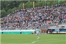 so erklärte: „Wir haben mit 22 Spielern einen großen Kader mit dabei. Da haben wir uns auf eine Verlängerung der Spielzeit geeinigt, um allen jungen Leuten Gelegenheit zu geben, sich zu beweisen.“ Mag sein, dass die Aussicht auf mehr Einsatzzeit die Akteure beflügelt hat. Ebenso kann die tolle Stimmung in dem reinen Fußballstadion ohne störende Aschenbahn, die vom versierten Moderator Christian Höreth immer wieder entfacht wurde, dazu beigetragen haben, dass die jungen Männer mit viel Schwung in die Partie gingen. Jedenfalls gerieten die Gäste schnell ins Hintertreffen und konnten danach nur noch versuchen, halbwegs unbeschädigt aus der Partie zu gehen.