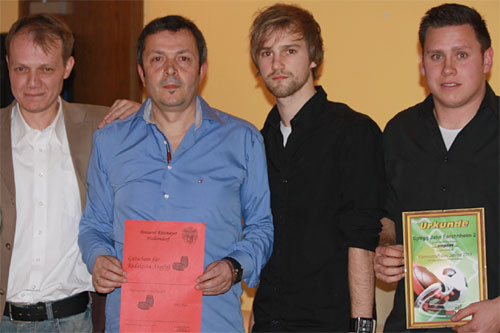 Die Mannschaft des Jahres 2011 im anpfiff-Spielkreis Forchheim-Erlangen wurde die SpVgg Forchheim 2. Über die Preise freuten sich (von links): Betreuer Ugur Baysan, Trainer und Abteilungsleiter Besnik Avdiji, die Spieler Florian Knauer und Patrick Honeck.
