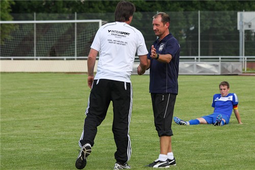 Das wars. Der Hirschaider Trainer Thomas van der Saal gratuliert seinem Memmelsdorfer Kollegen Rolf Vitzthum sportlich fair zum Erfolg.