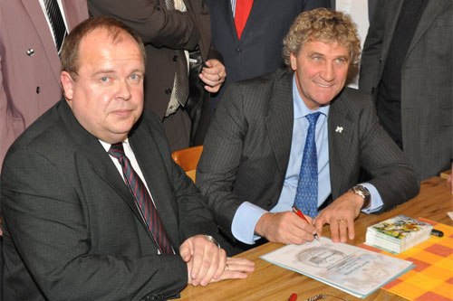 Jean-Marie Pfaff trägt sich ins Sportbuch der Marktgemeinde Grafengehaig ein - die Bürgermeister Werner Burger (links) vertrat.