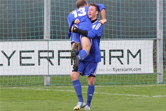 Leinachs Mario Christ (re.) hebt aus Freude Mitspieler und Torschütze Daniel Bufe in die Luft.