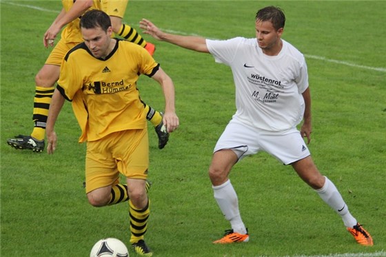 Christoph Herl (links im gelben Trikot beim Spiel gegen die SpVgg Trunstadt) verwandelte den hier thematisierten Strafstoß sicher zum 4:0 Endstand.