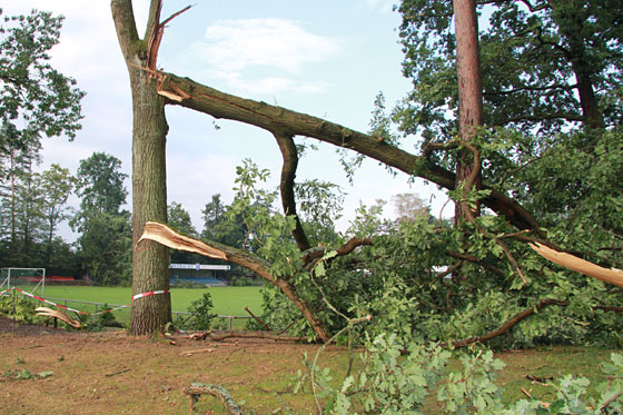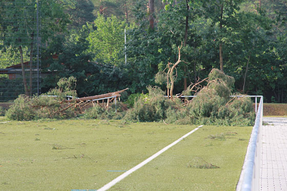 Umgeknickte Bäume krachten auf die Umrandung und das Spielfeld des Kunstrasens.
