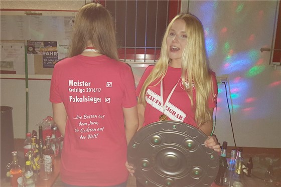 Selina Heidig (re.) präsentiert Schale und Meistershirt der "(Un)-Aufsteigbaren"