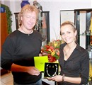 "Ich habe selber auch für dich gestimmt" begrüßte Gerald Kastner Melanie Stammberger, als die Gewinnerin der anpfiff-Wahl ihren Überraschungspreis abholen durfte. Denn erst nach Beendigung der Abstimmung entschloss sich der Spielleiter des SC 08 Bamberg, Inhaber einer ortsansässigen Goldschmiede, spontan eine Schmuckkollektion - ganz auf die hübsche Studentin zugeschnitten - zu entwerfen und ihr in seinen Räumlichkeiten bei einem kleinen Empfang zu überreichen. Der Coup war gelungen. Denn die Halskette, das Paar Ohrringe und nicht zuletzt ein funkelnder Ring, zauberten Melanie Stammberger ein Lächeln ins Gesicht. Gerald Kastner ließ sich die Gelegenheit nicht nehmen und stattete die zierliche Blondine gleich noch mit einer Anstecknadel seines Vereines aus, verbunden mit der herzlichen Einladung und der Hoffnung, das sympathische Topmodel bei einem der nächsten Heimspiele auf der Anlage im Volkspark begrüßen zu dürfen.